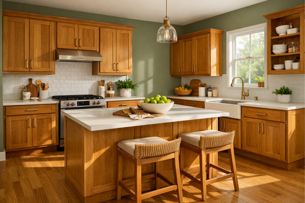 Kitchen → warm white walls + oak cabinetry